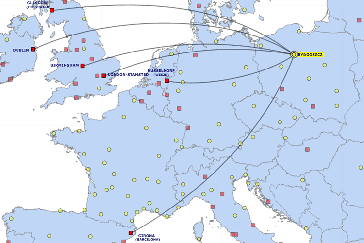 Zbiorkom.pl > Bydgoszcz traci aż trzy trasy linii Ryanair! 2014-01-02 Bydgoszcz traci aż trzy trasy linii Ryanair!W nadchodzącym sezonie letnim irlandzki Ryanair rezygnuje aż z trzech tras z Bydgoszczy.Przewoźnik bowiem zaptrzestanie lotów na trasach: