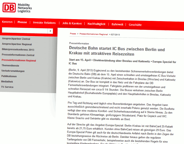 Zbiorkom.pl > Deutsche Bahn uruchamia autobus między Berlinem i Katowicami 2013-04-09 Deutsche Bahn uruchamia autobus między Berlinem i KatowicamiW poniedziałek 15 kwietnia 2013 roku niemieckie koleje Deutsche Bahn (DB) uruchomią bezpośrednie połączenie autobusowe IC Bus na trasie Berlin - Wrocław - Katowice - Kraków.