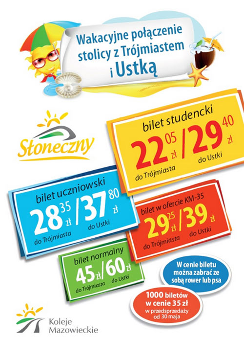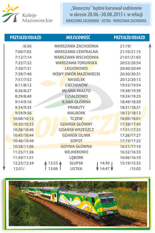Zbiorkom.pl > Pociąg Słoneczny z Warszawy do Trójmiasta i Ustki 2015-05-18 Pociąg Słoneczny z Warszawy do Trójmiasta i UstkiW czerwcu 2015 roku, już po raz 11, spółka Koleje Mazowieckie uruchamia specjalny pociąg nad morze Słoneczny.Pociąg Słoneczny będzie kursował codziennie w okresie od 28 czerwca do 30 sierpnia 2015 roku w relacji Warszawa - Trójmiasto - Słupsk - Ustka. Zatem w tym roku Słoneczny pojedzie aż do Ustki.
