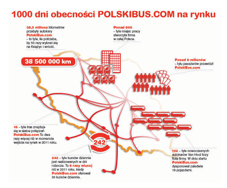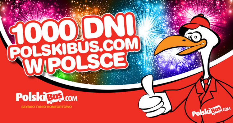 Zbiorkom.pl > PolskiBus świętuje 1000 dni działania w Polsce 2014-03-17 PolskiBus świętuje 1000 dni działania w PolsceLinie autobusowe PolskiBus już od 1 000 dni działają na polskim rynku dalekobieżnych przewozów autobusowych. W tym czasie z usług PolskiBus skorzystało 6 milionów pasażerów.W ciągu tego okresu PolskiBus rozbudował liczbę tras z 8 do 16, oferując ekspresowe połączenia do 20 polskich miast i 5 europejskich lokalizacji. W listopadzie 2013 roku firma uruchomiła we Wrocławiu drugą bazę operacyjną i stworzyła tam ponad 160 nowych miejsc pracy.